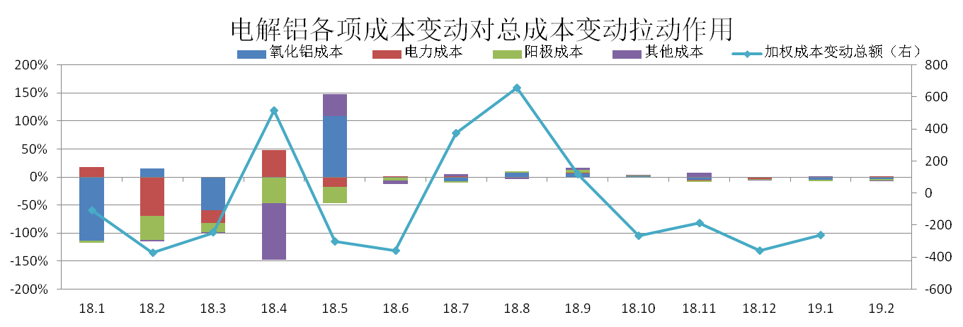 分析認為:2月氧化鋁成本、陽(yáng)極成本均有所回落,但電力成本稍有上漲,整體電解鋁價(jià)格的成本有小幅的下跌。2月氧化鋁價(jià)格繼續下跌,片堿價(jià)格受其影響位于低位,預計電解鋁成本降幅增大。